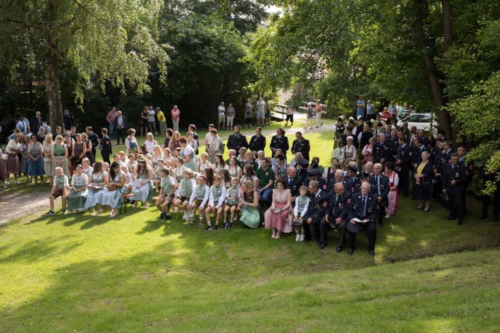 Musik war in ganz Reisbach zu hören, denn die Freiwillige Feuerwehr ließ es sich nicht nehmen, traditionell in den großen Ehrenabend zu starten und die Ehrengäste mit musikalischer Begleitung abzuholen. Und so marschierten die Einsatzkräfte dem vereinseigenen Trommlercorps hinterher. Das Ziel: Festmutter Martha Haslbeck. Sie wartete schon mit den Festdamen, Festmädchen und -buben im Garten. Hier stimmte man sich in geselliger Runde ein, ehe es zum Abholen des Patenvereins aus Reith ging. Nach dem Standkonzert, das die Reisbacher Musikanten zum Besten gaben, ging es im Festzug zur Wolfsindis-Kapelle, wo man mit Pfarrer Tony die Gedenkandacht feierte.
