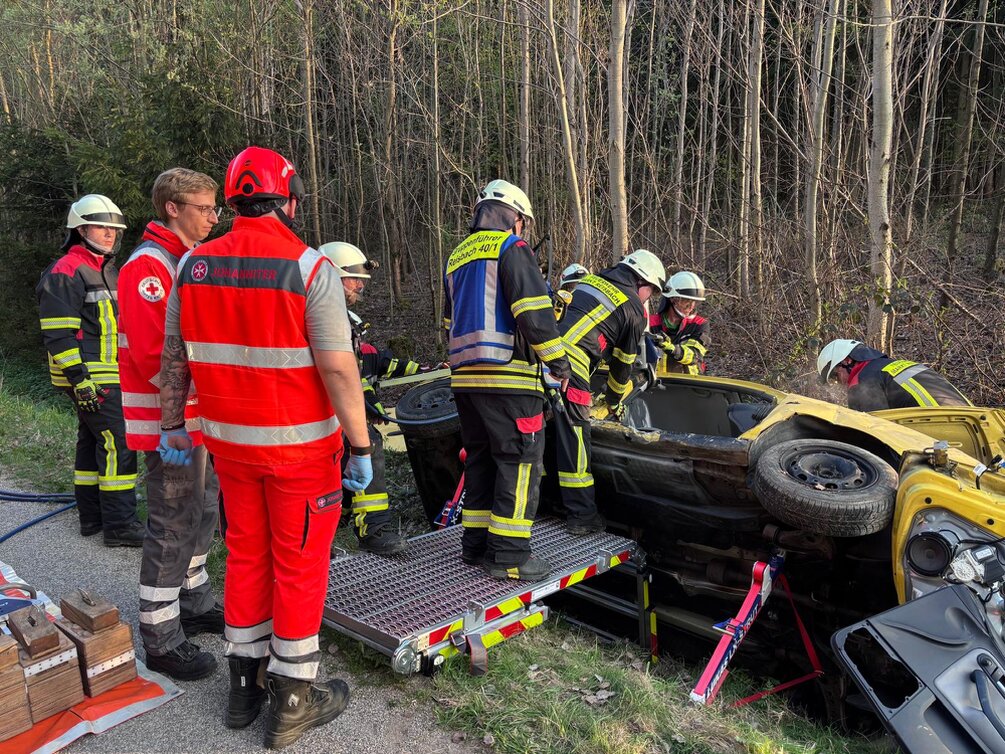 Nach dem Eintreffen übernahm der stellvertretende Kommandant Stefan Dittrich aus Marklkofen die Einsatzleitung. Zunächst wurde die Einsatzstelle abgesichert und die Lage erkundet. Der Fokus lag klar auf der Rettung der Verletzten: Ein Kind konnte zügig aus einem Fahrzeug befreit werden, eine weitere Person musste aufwendig und schonend gerettet werden, ein vermisstes Kind wurde im angrenzenden Wald gesucht und gefunden, Parallel dazu bereiteten die Einsatzkräfte einen möglichen Hubschrauberlandeplatz vor.